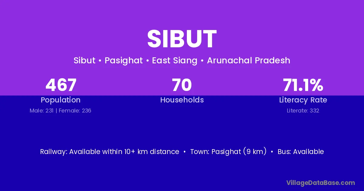 Pasighat (9 km) is the nearest town to Sibut village for major economic activities and is located approximately 9 km away.