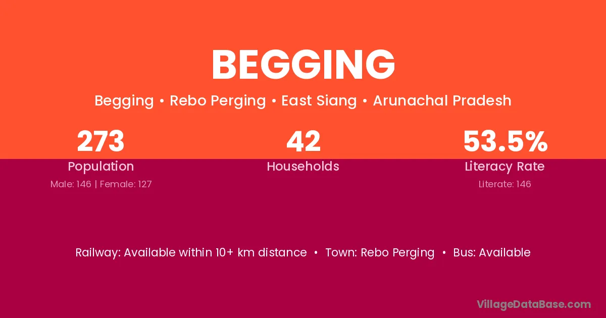 Begging village has a total population of 273 people, of which 146 are males and 127 are females.