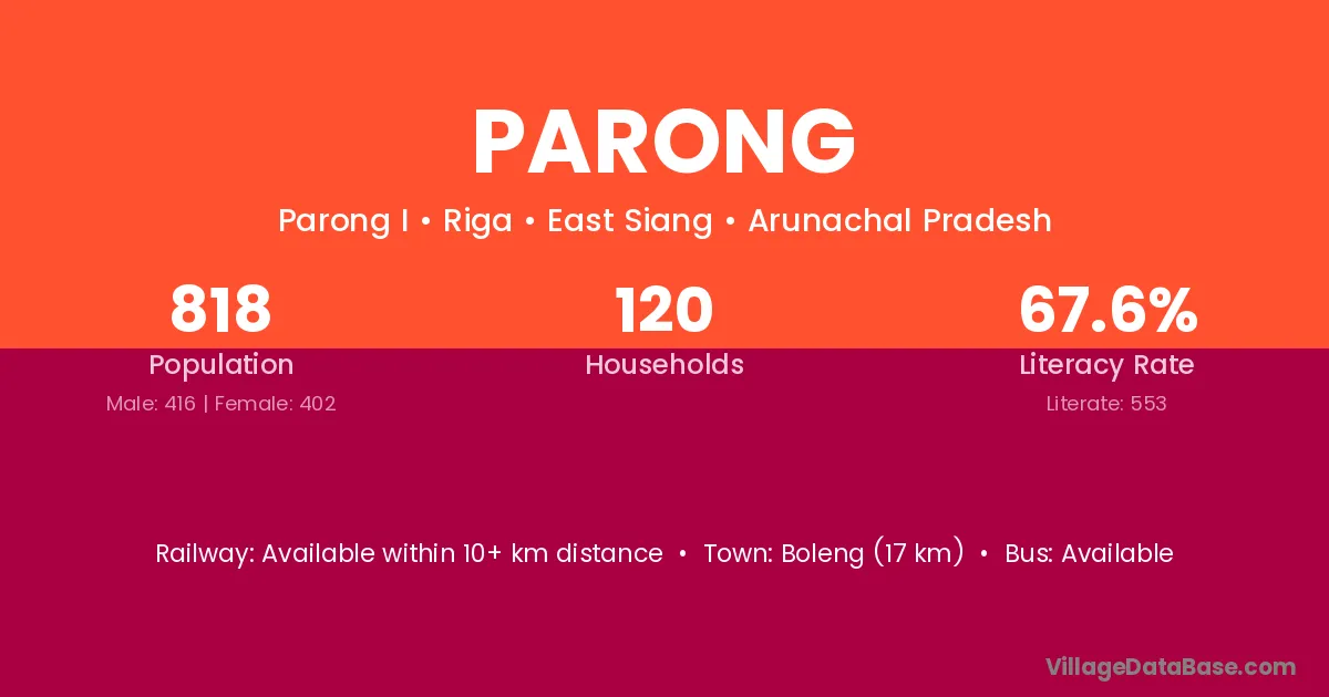 Boleng (17 km) is the nearest town to Parong village for major economic activities and is located approximately 17 km away.