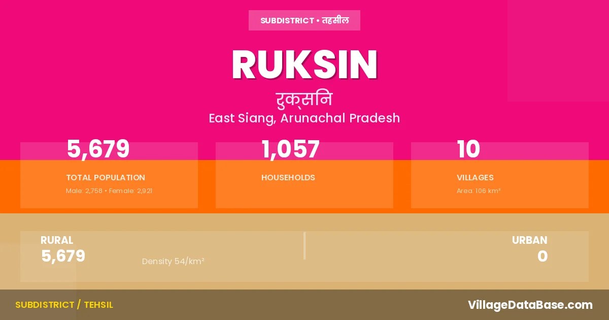 According to the 2011 census The total area of Ruksin Circle is 106 km², with a population of 5679 people. The population density is 54 inhabitants per square kilometre, and there are approximately 1057 houses in the sub district.