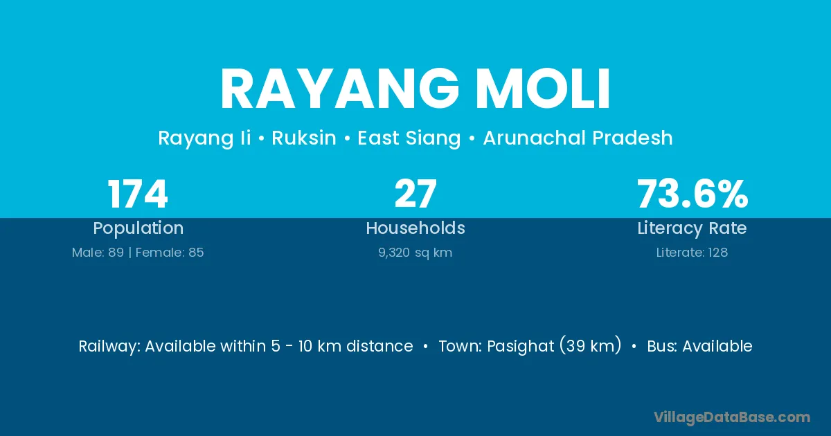 Pasighat (39 km) is the nearest town to Rayang Moli village for major economic activities and is located approximately 39 km away.