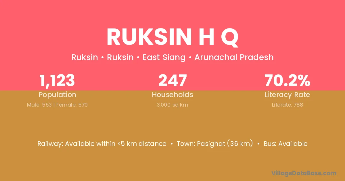 Pasighat (36 km) is the nearest town to Ruksin H Q village for major economic activities and is located approximately 36 km away.