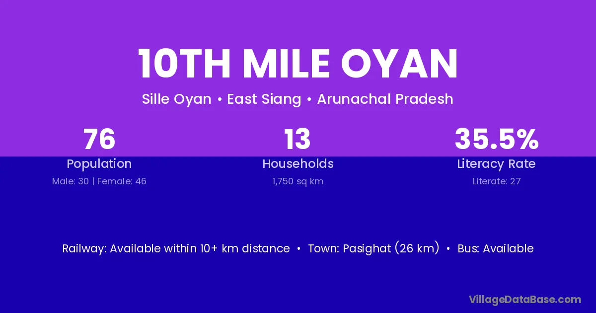 Pasighat (26 km) is the nearest town to 10th Mile Oyan village for major economic activities and is located approximately 26 km away.