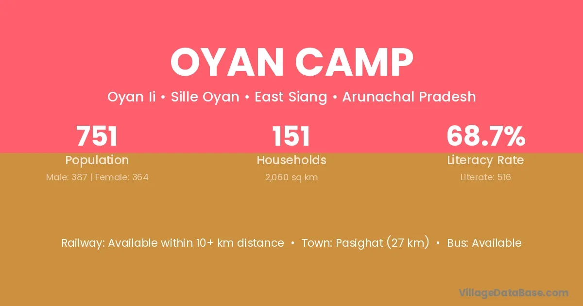 Pasighat (27 km) is the nearest town to Oyan Camp village for major economic activities and is located approximately 27 km away.