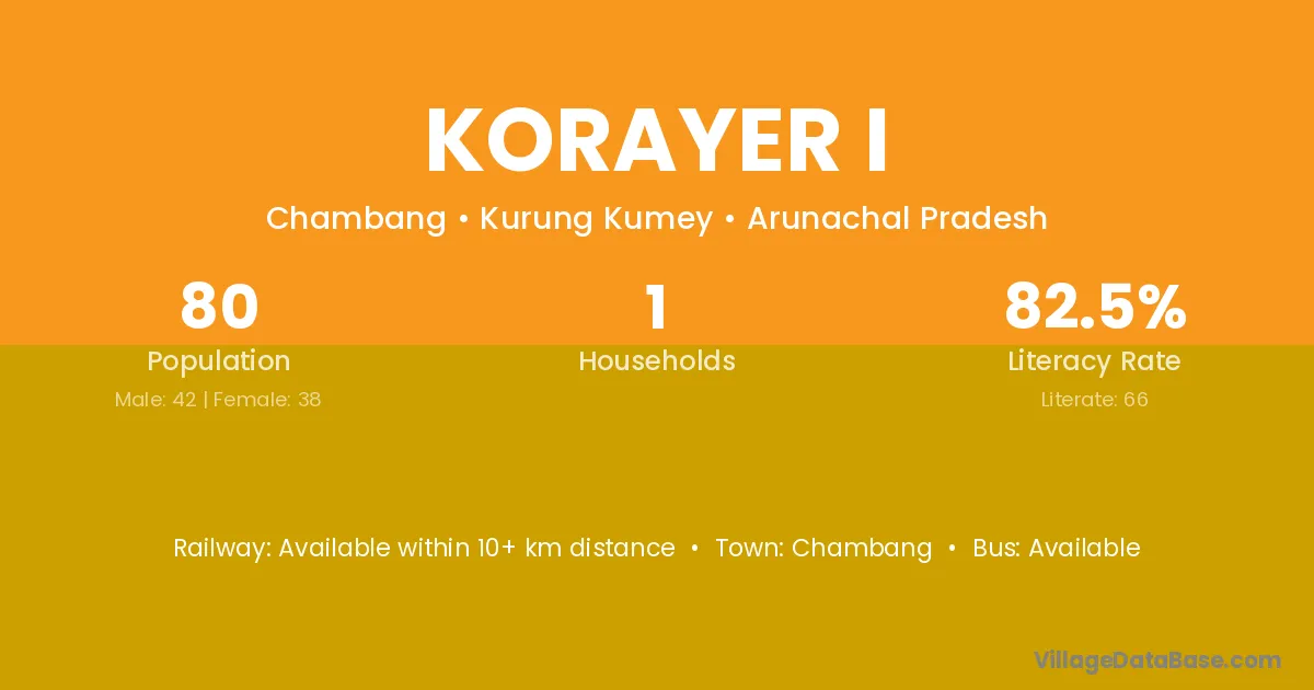 Korayer I village has a total population of 80 people, of which 42 are males and 38 are females.