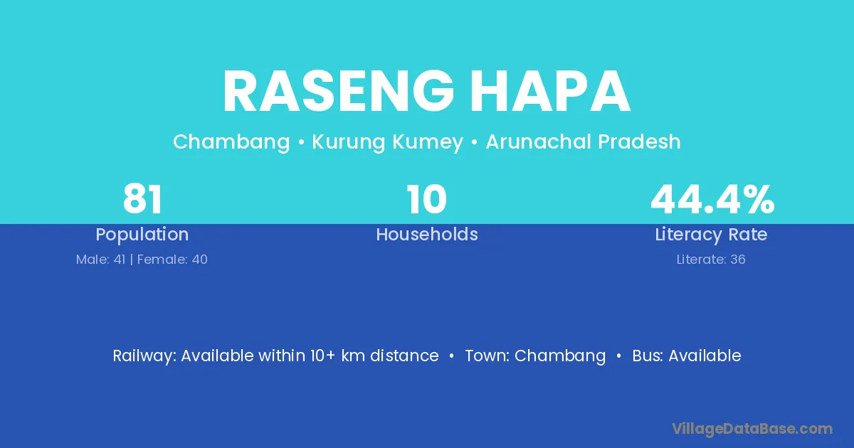 Raseng Hapa village has a total population of 81 people, of which 41 are males and 40 are females.