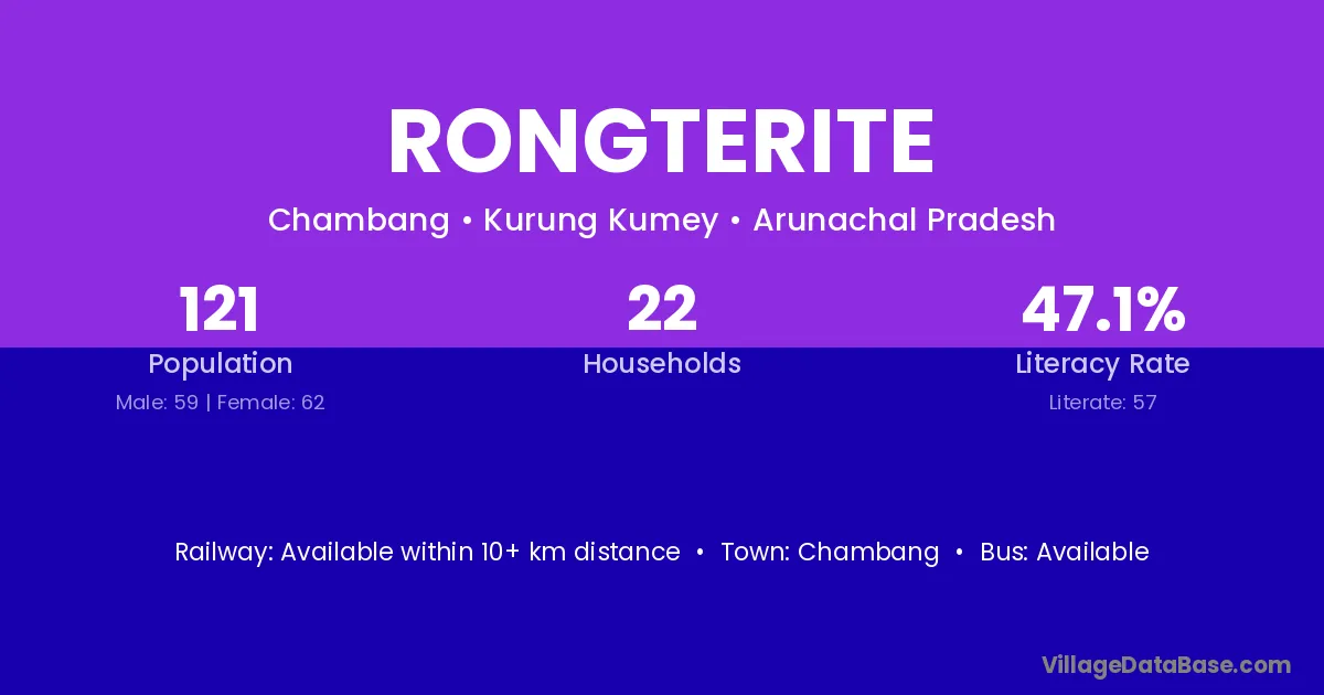 Rongterite village has a total population of 121 people, of which 59 are males and 62 are females.