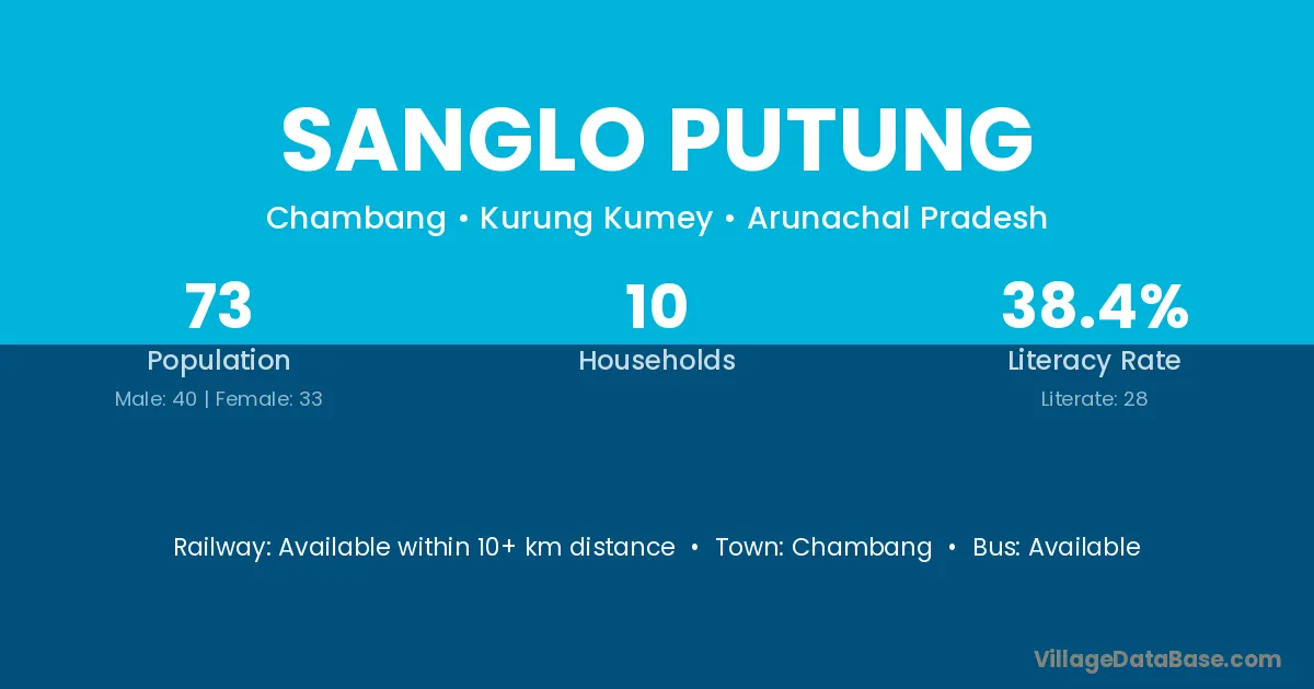 The literacy rate of Sanglo Putung village is 38.36%. Male literacy stands at 47.50% and female literacy at 27.27%.