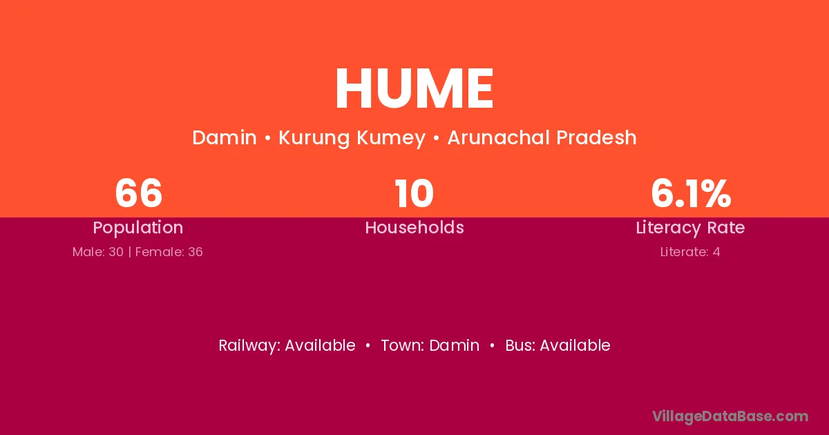 The literacy rate of Hume village is 6.06%. Male literacy stands at 0.00% and female literacy at 11.11%.