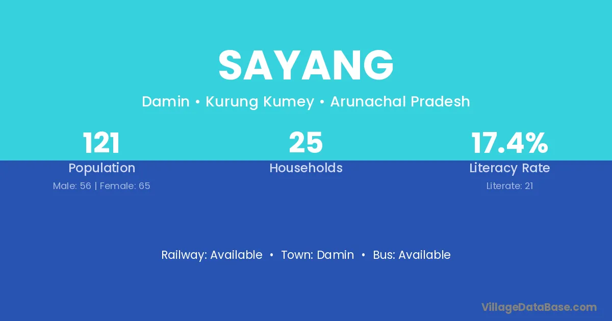 Sayang village has a total population of 121 people, of which 56 are males and 65 are females.
