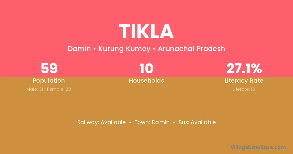 The literacy rate of Tikla village is 27.12%. Male literacy stands at 32.26% and female literacy at 21.43%.