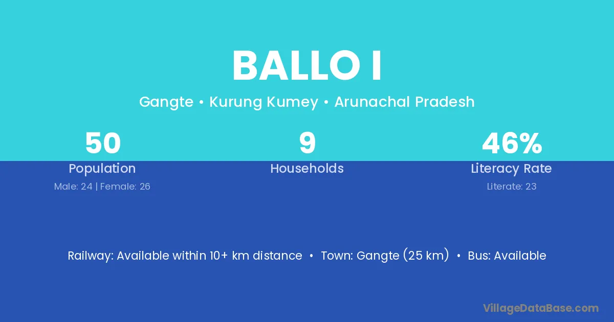 The literacy rate of Ballo I village is 46.00%. Male literacy stands at 50.00% and female literacy at 42.31%.