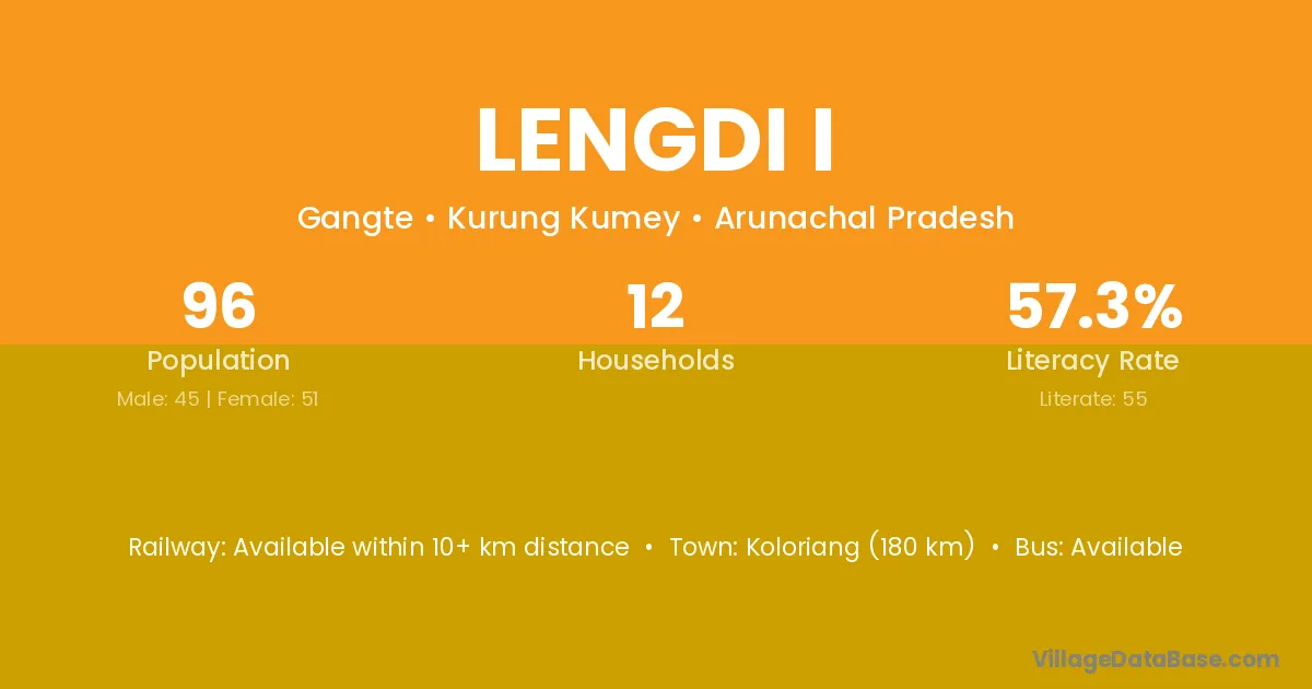 Koloriang (180 km) is the nearest town to Lengdi I village for major economic activities and is located approximately 180 km away.