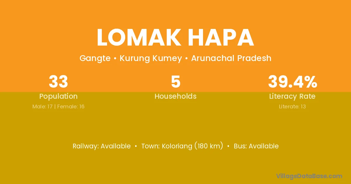 The literacy rate of Lomak Hapa village is 39.39%. Male literacy stands at 35.29% and female literacy at 43.75%.
