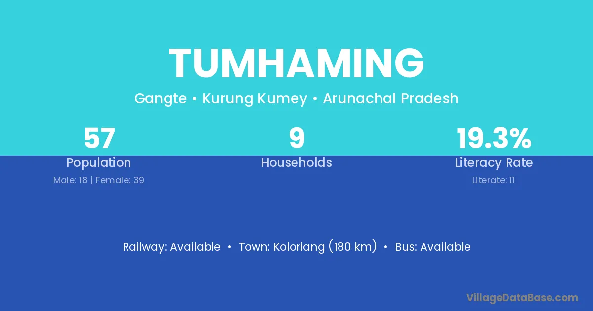 Tumhaming village has a total population of 57 people, of which 18 are males and 39 are females.