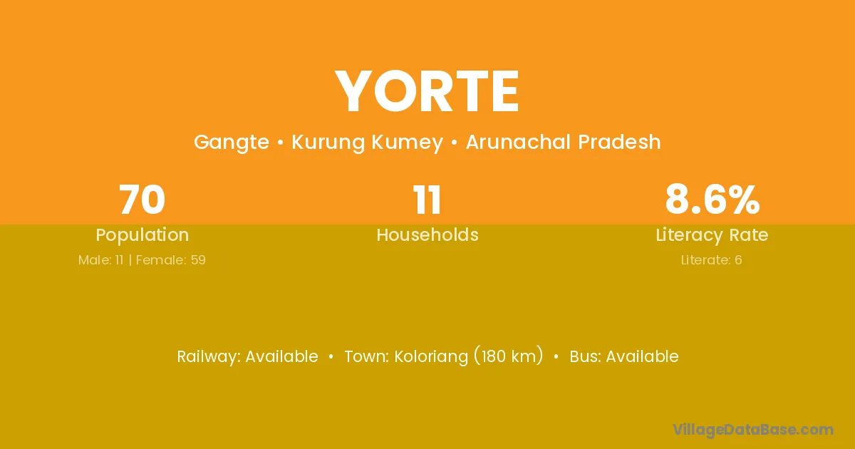 Yorte village has a total population of 70 people, of which 11 are males and 59 are females.