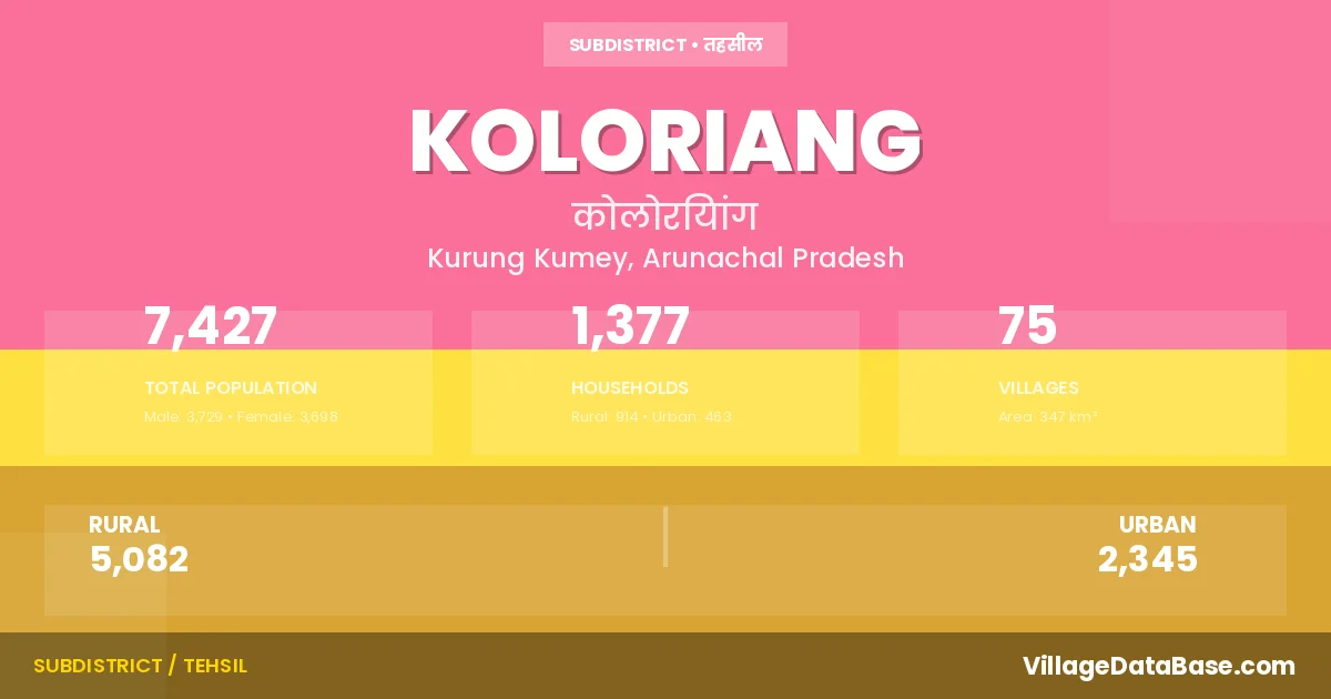 According to the 2011 census The total area of Koloriang Circle is 347 km², with a population of 7427 people. The population density is 21 inhabitants per square kilometre, and there are approximately 1377 houses in the sub district.