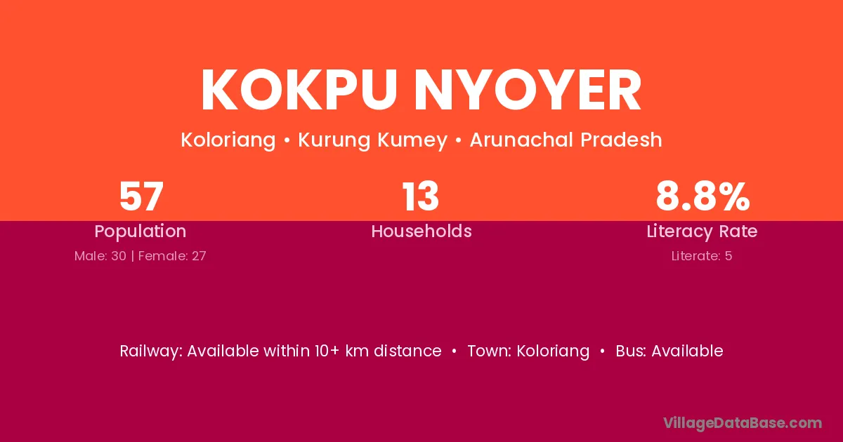 Kokpu Nyoyer village has a total population of 57 people, of which 30 are males and 27 are females.
