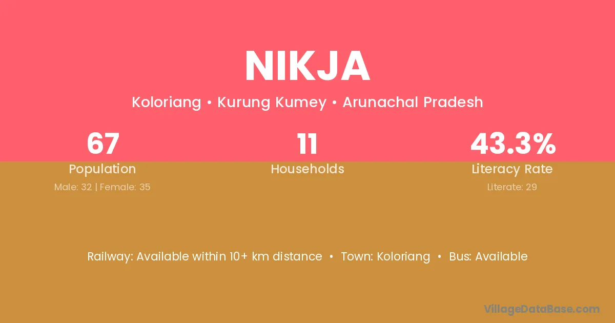 Nikja village has a total population of 67 people, of which 32 are males and 35 are females.