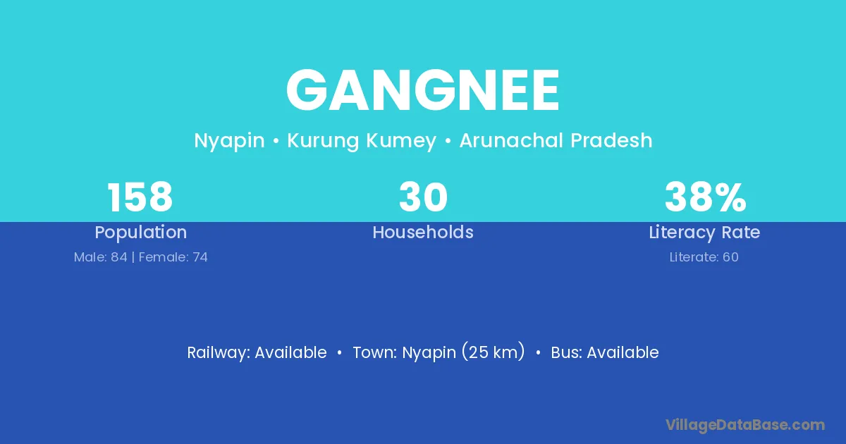 Nyapin (25 km) is the nearest town to Gangnee village for major economic activities and is located approximately 25 km away.