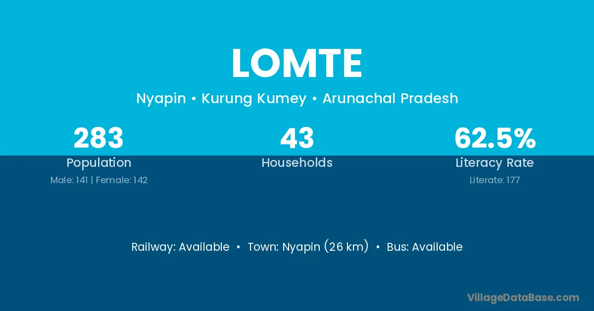 Nyapin (26 km) is the nearest town to Lomte village for major economic activities and is located approximately 26 km away.
