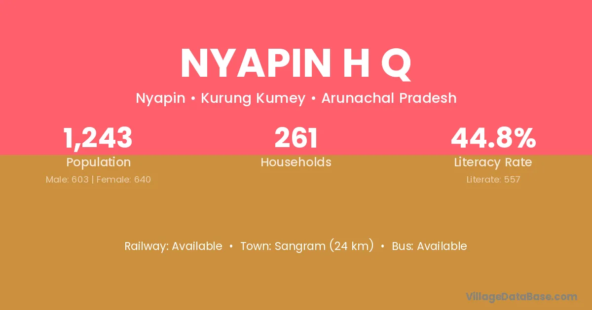 Nyapin H Q village has a total population of 1,243 people, of which 603 are males and 640 are females.