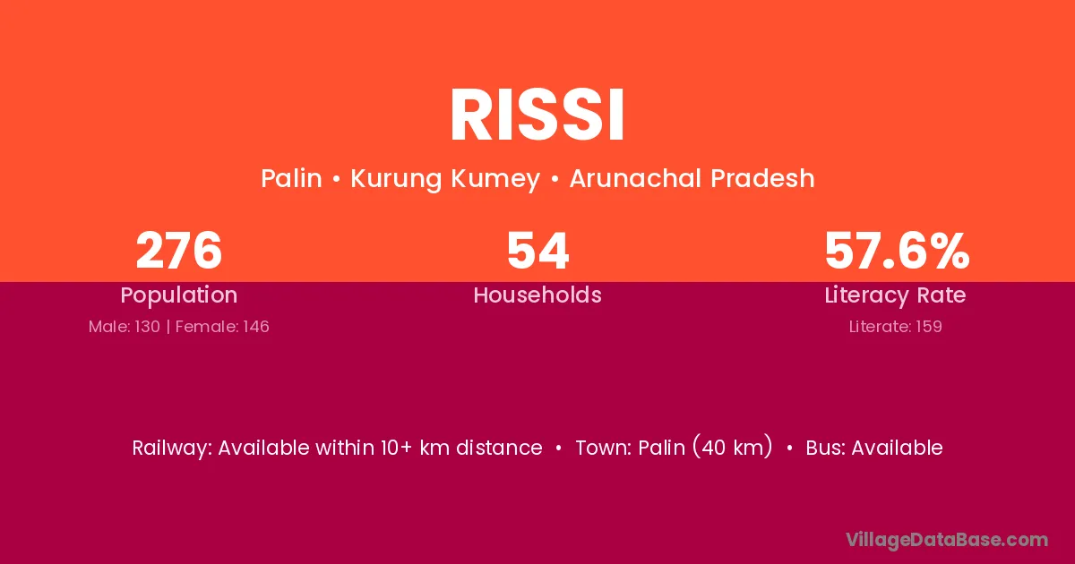 Palin (40 km) is the nearest town to Rissi village for major economic activities and is located approximately 40 km away.