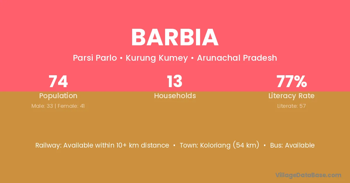Koloriang (54 km) is the nearest town to Barbia village for major economic activities and is located approximately 54 km away.