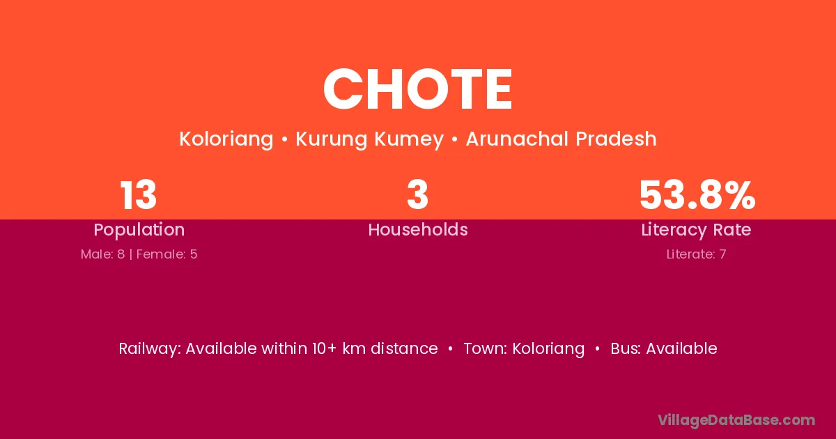 Koloriang (63 km) is the nearest town to Chote village for major economic activities and is located approximately 63 km away.