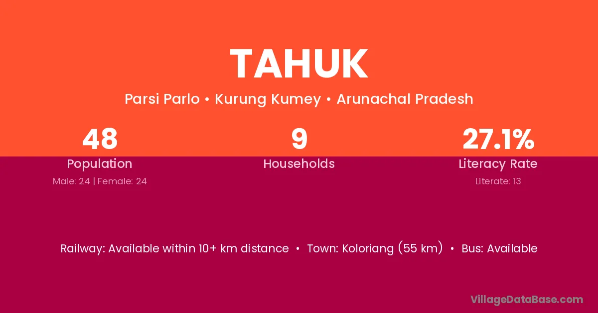 Tahuk village has a total population of 48 people, of which 24 are males and 24 are females.