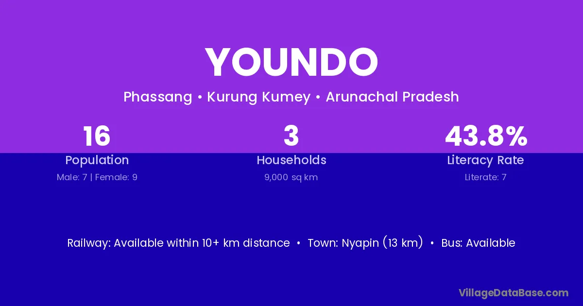 Nyapin (13 km) is the nearest town to Youndo village for major economic activities and is located approximately 13 km away.