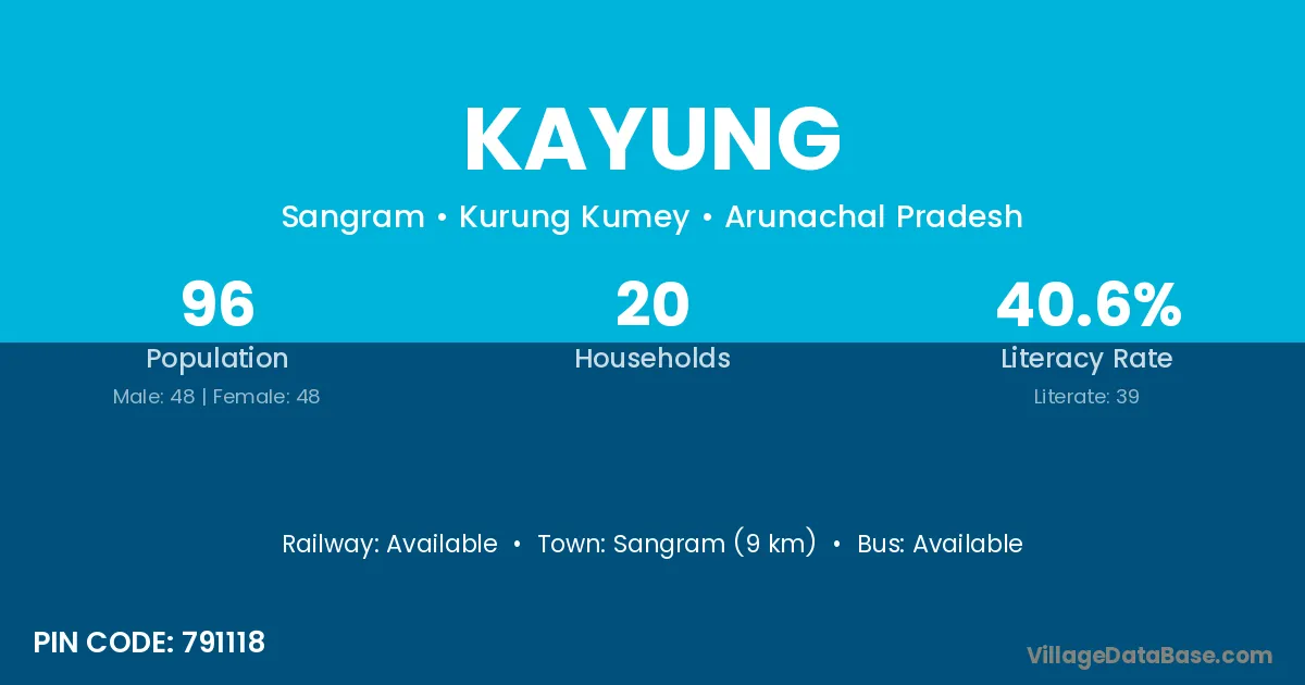 Kayung village has a total population of 96 people, of which 48 are males and 48 are females.