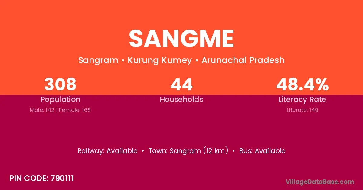 Sangram (12 km) is the nearest town to Sangme village for major economic activities and is located approximately 12 km away.