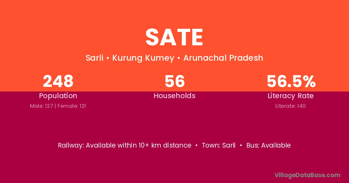Sate village has a total population of 248 people, of which 127 are males and 121 are females.