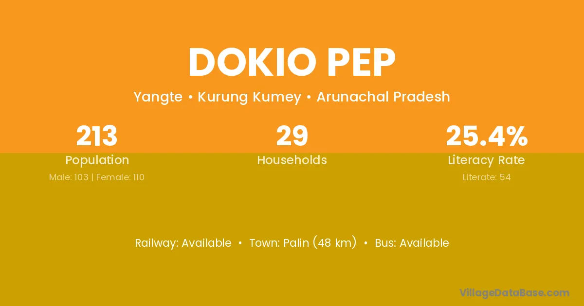 The literacy rate of Dokio Pep village is 25.35%. Male literacy stands at 31.07% and female literacy at 20.00%.