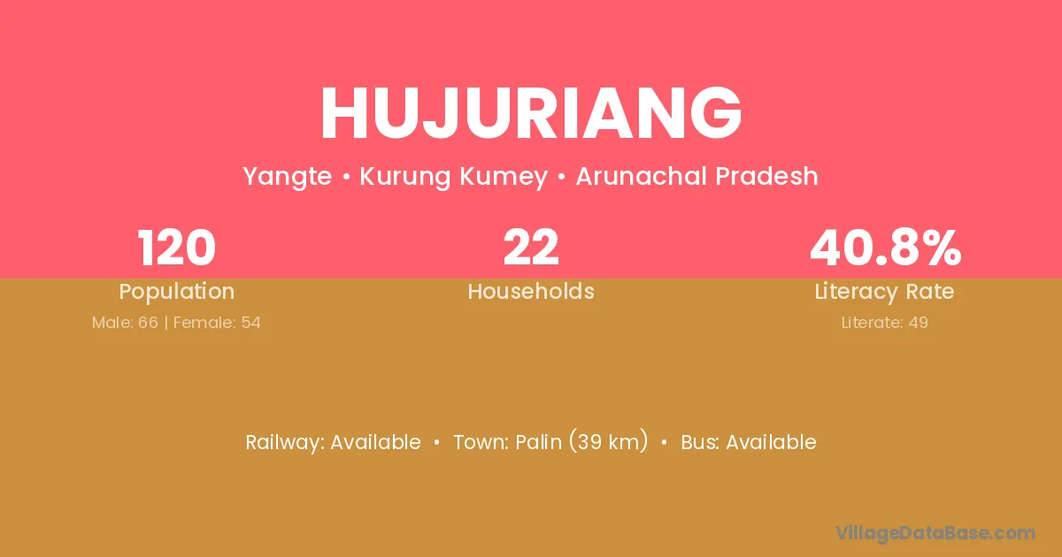 Palin (39 km) is the nearest town to Hujuriang village for major economic activities and is located approximately 39 km away.