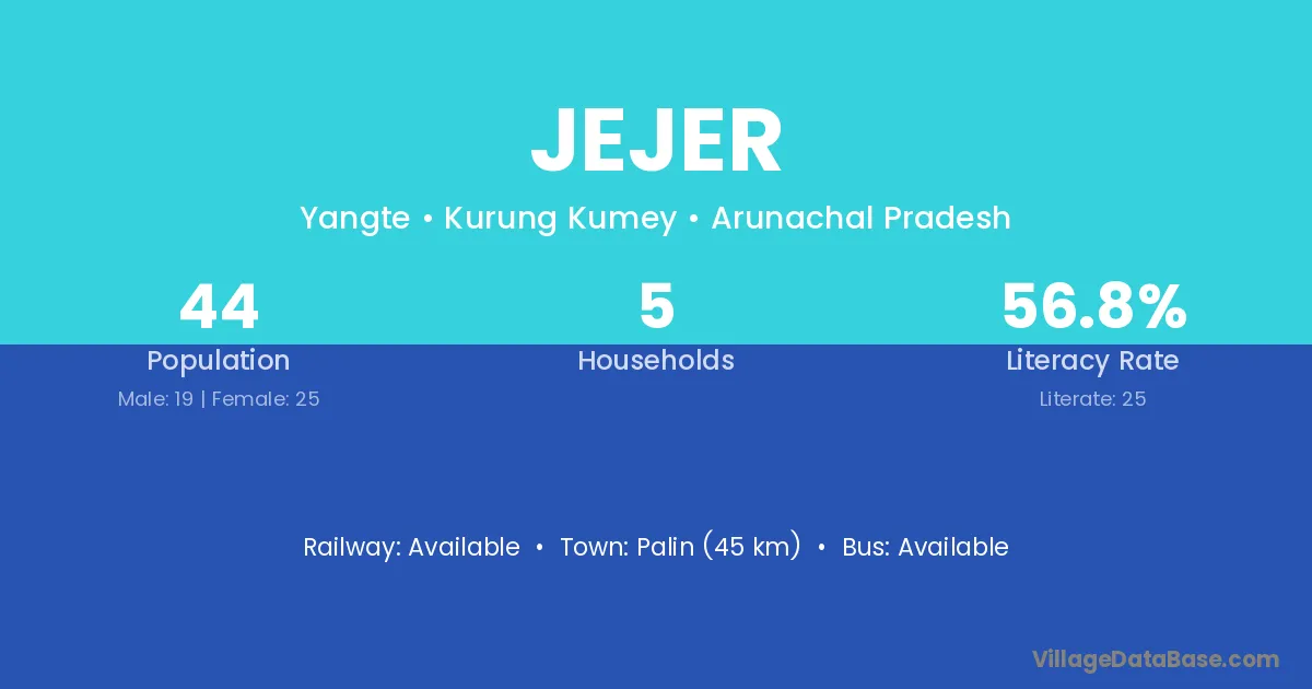 Palin (45 km) is the nearest town to Jejer village for major economic activities and is located approximately 45 km away.