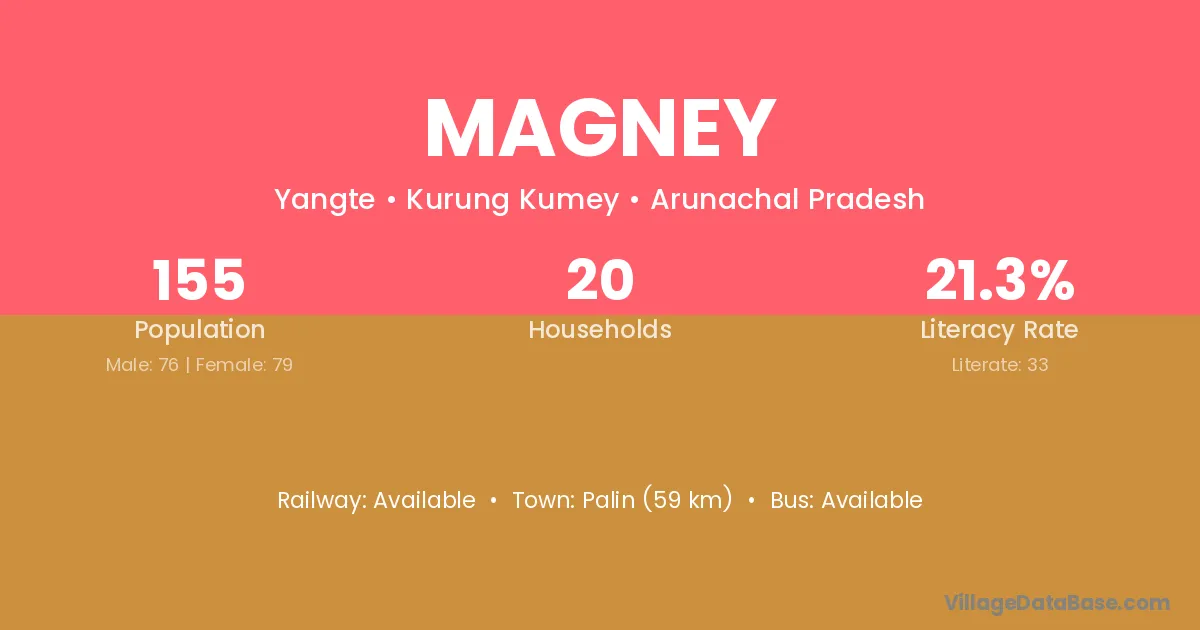 Palin (59 km) is the nearest town to Magney village for major economic activities and is located approximately 59 km away.