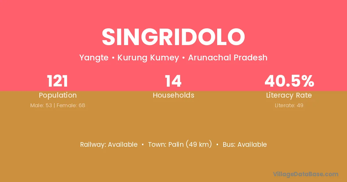 Singridolo village has a total population of 121 people, of which 53 are males and 68 are females.