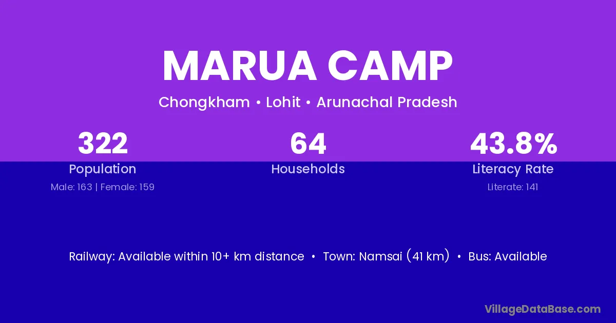 Namsai (41 km) is the nearest town to Marua Camp village for major economic activities and is located approximately 41 km away.