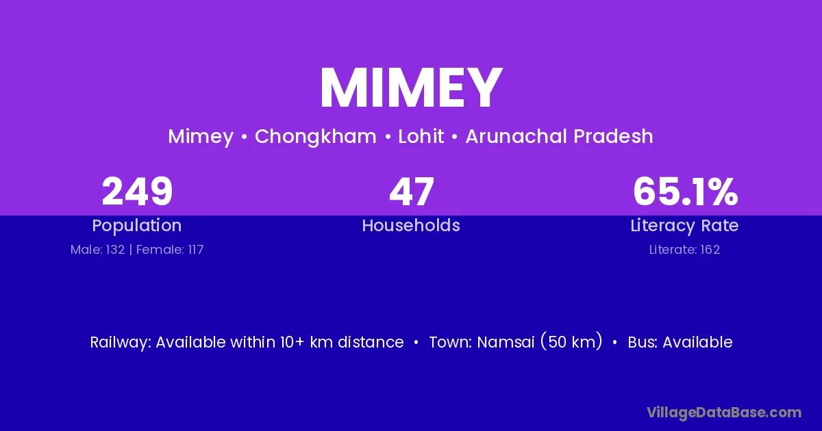 Namsai (50 km) is the nearest town to Mimey village for major economic activities and is located approximately 50 km away.
