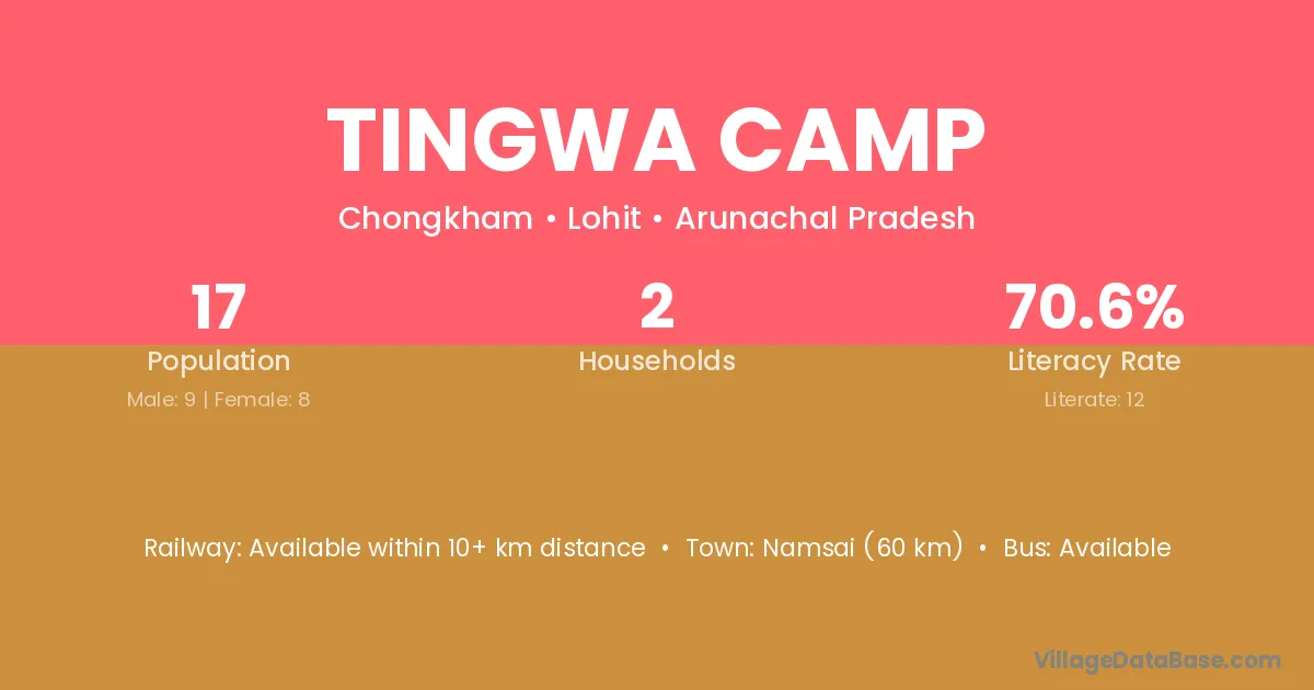 Namsai (60 km) is the nearest town to Tingwa Camp village for major economic activities and is located approximately 60 km away.
