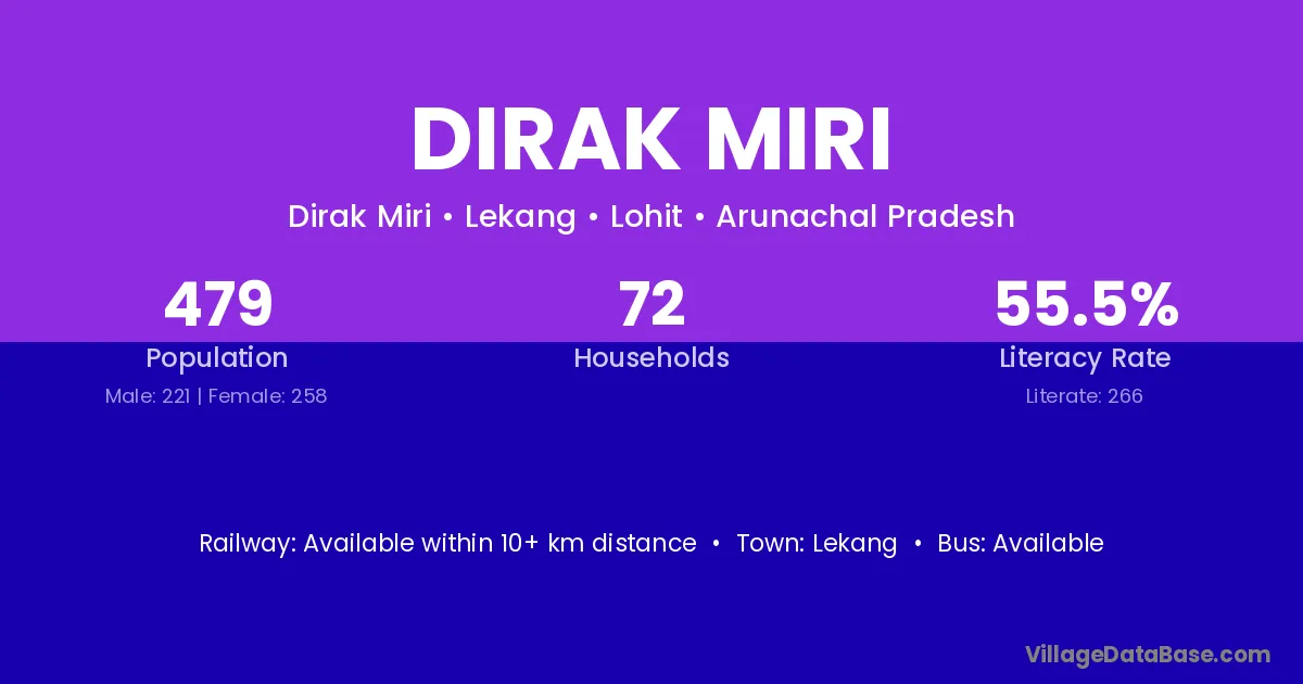 Dirak Miri village has a total population of 479 people, of which 221 are males and 258 are females.