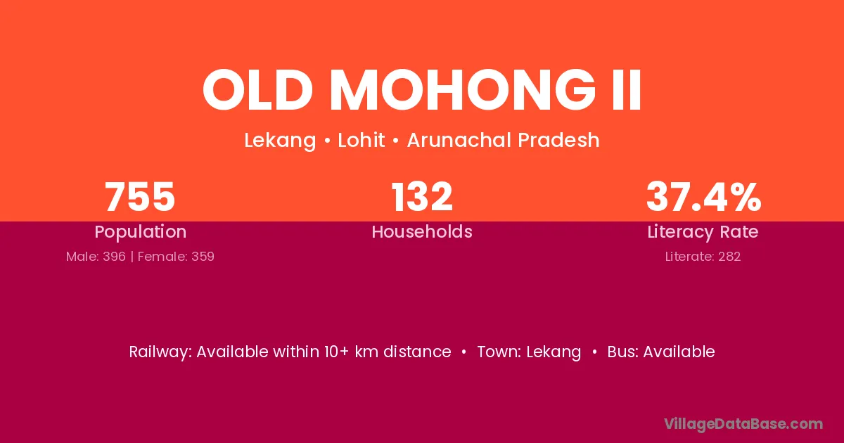 The literacy rate of Old Mohong Ii village is 37.35%. Male literacy stands at 46.97% and female literacy at 26.74%.