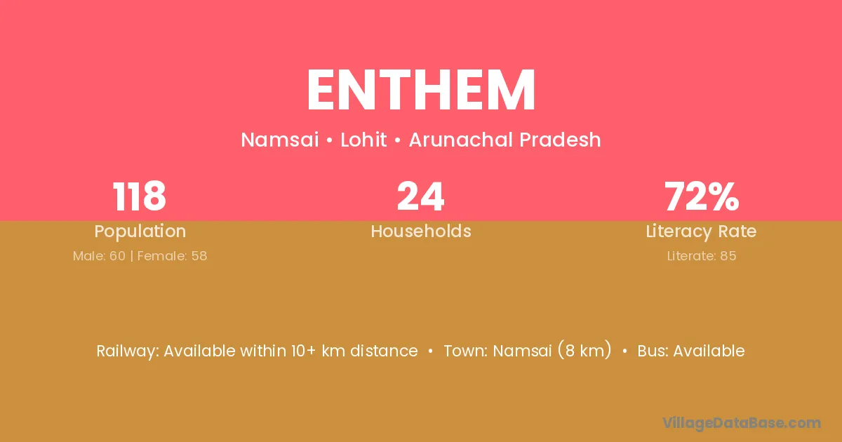 Namsai (8 km) is the nearest town to Enthem village for major economic activities and is located approximately 8 km away.