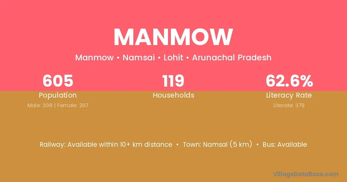 Namsai (5 km) is the nearest town to Manmow village for major economic activities and is located approximately 5 km away.