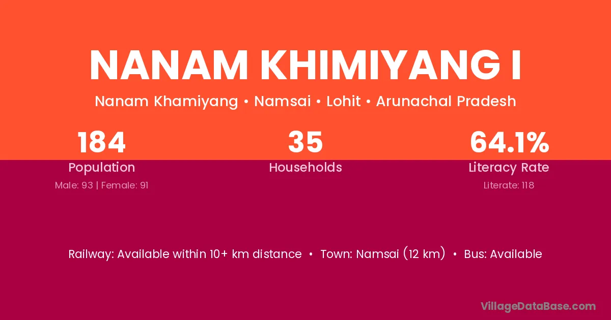 Namsai (12 km) is the nearest town to Nanam Khimiyang I village for major economic activities and is located approximately 12 km away.