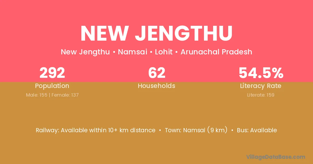 Namsai (9 km) is the nearest town to New Jengthu village for major economic activities and is located approximately 9 km away.