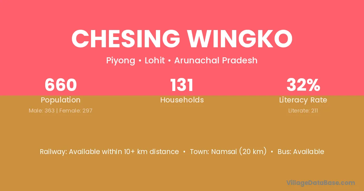 Namsai (20 km) is the nearest town to Chesing Wingko village for major economic activities and is located approximately 20 km away.