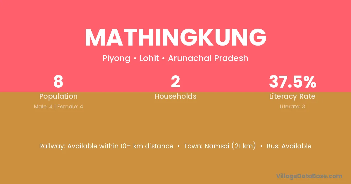 Namsai (21 km) is the nearest town to Mathingkung village for major economic activities and is located approximately 21 km away.
